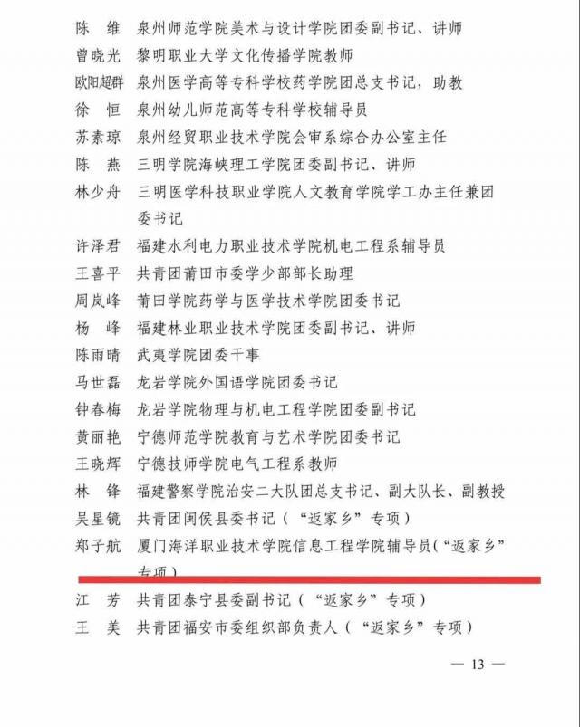 近日,共青团福建省委文件公布了2020年福建省大中专学生志愿者暑期“三下乡”社会实践活动优秀集体和个人的名单,厦门海洋职业技术学院信息工程学院辅导员郑子航老师获优秀工作者(“返家乡”专项)荣誉称号!!!