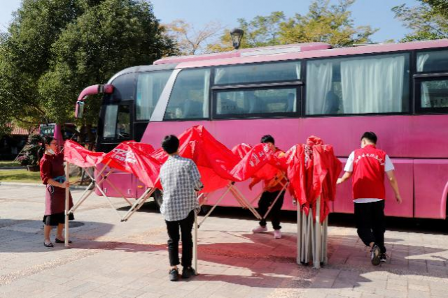 他们顶着太阳,帮忙布置场地