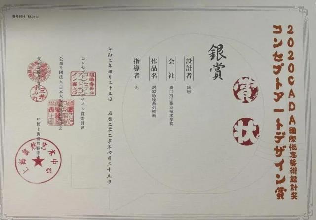 近年来陈思老师在专业领域不断探索、实践,先后多次参加各项国际艺术赛事,其中,她在2020年4月由日本大阪视觉艺术协会主办的2020CADA国际概念艺术设计奖中荣获银奖。此外,她还指导学生参加福建省大学生艺术节、福建省职业院校技能竞赛以及中国大学生计算机设计大赛中也屡获佳绩。