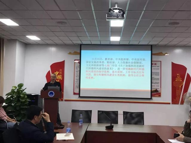 系党总支书记王火灵从加强师德师风建设的总体要求、全面加强教师队伍思想政治工作、大力提升教师职业道德素养、将师德师风建设要求贯穿教师管理全过程、着力营造全社会尊师重教氛围、推进师德师风建设任务落到实处等六个方面解读了《关于加强和改进新时代师德师风建设的意见》18条的内容,强调要把立德树人的成效作为检验我们一切工作的根本标准,把师德师风作为评价教师队伍素质的第一标准;激励广大教师要努力成为“四有”好老师,着力培养德智体美劳全面发展的社会主义建设者和接班人。