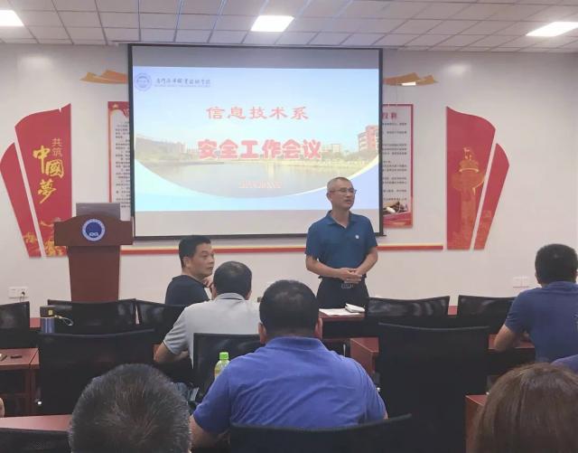 6月18日,信息技术系在系党建活动室召开安全工作会议,再次学习学院《关于开展2019 年“安全生产月” 和“八闽安全发展行”活动的通知》精神,分析当前校园安全形势,部署下一阶段安全工作任务。