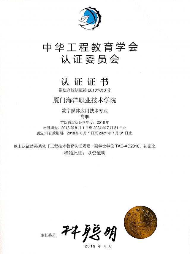 我系数字媒体应用技术专业于2017年9月参加IEET TAC-AD工程技术教育认证,于2018年12月迎接实地访评工作并通过了周期性认证,进一步强化了专业建设的诊断与改进,有力推进了专业内涵式发展。