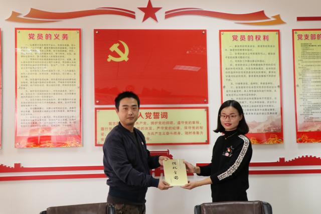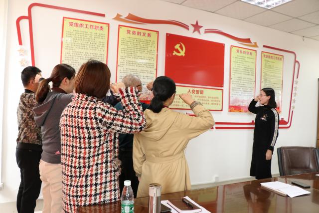 面对鲜红的党旗,本次过“政治生日”的党员谢玲老师,举起右手,带领支部党员重温入党誓词。她回忆了自己入党的初心和理想,表示要牢记作为一名党员的使命与担当。支部书记邓力代表支部向谢玲赠送习近平总书记著书《摆脱贫困》,鼓励她坚持学习,不忘初心。