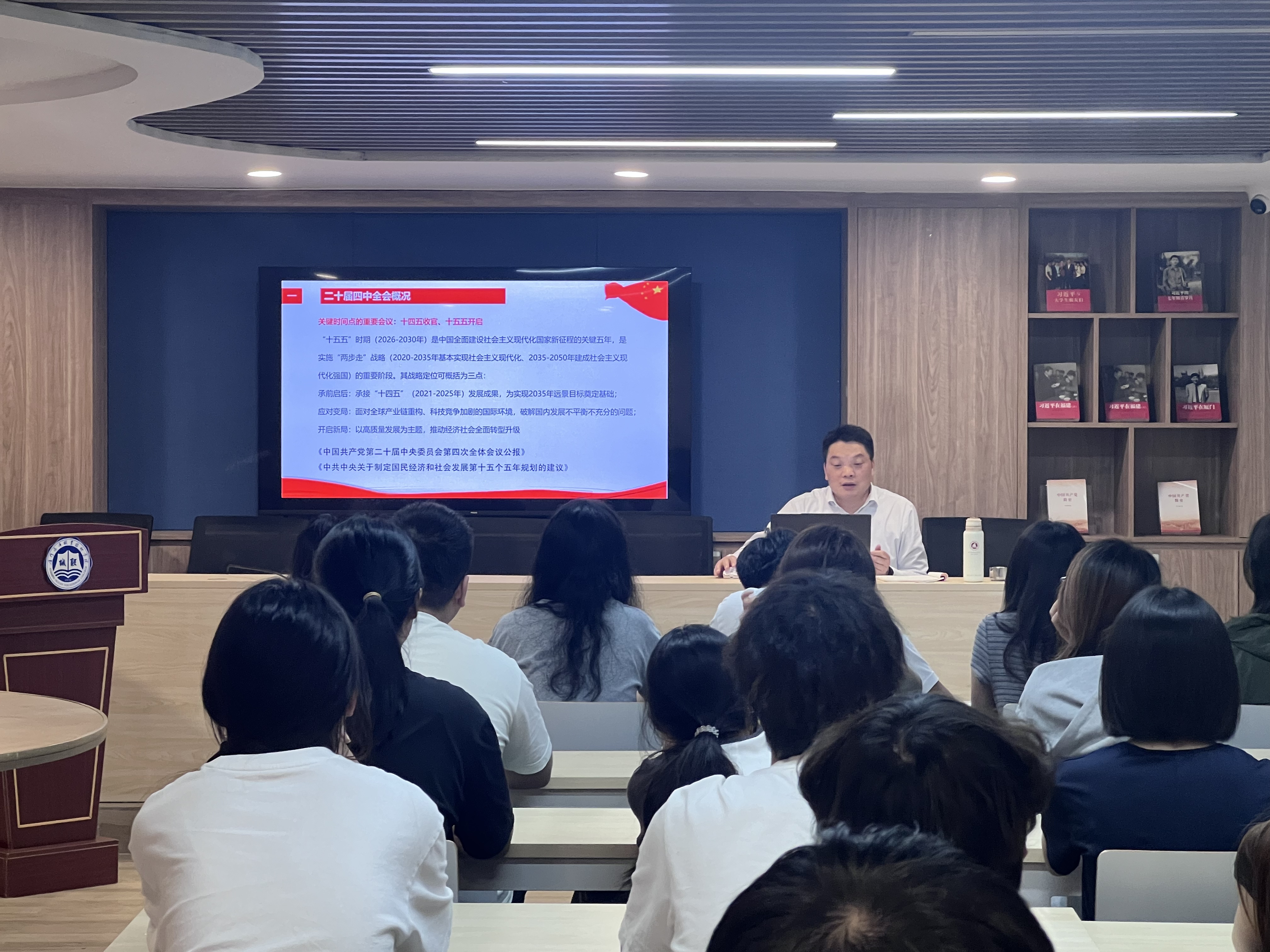 课程围绕党的二十届四中全会概况、数字中国建设、青年担当三方面展开。林晓鹏结合《中国共产党第二十届中央委员会第四次全体会议公报》与《中共中央关于制定国民经济和社会发展第十五个五年规划的建议》,阐述了高水平科技自立自强、发展新质生产力、深入推进数字中国建设的重要意义。他详细介绍了数字经济、数字社会、数字政府、数字生态等方向发展前景,勉励同学们夯实“电子+信息+AI”交叉知识体系,以项目驱动实践,在数字化浪潮中争做有为青年。