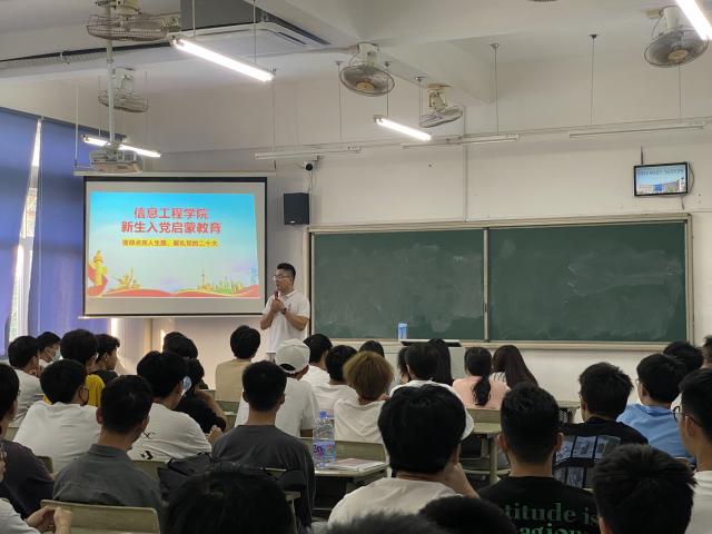 为切实做好2022级新生入党启蒙教育工作,帮助新生更好地了解党的基本知识、认识党的发展历程、端正入党动机、熟知入党程序,引导新生积极向党组织靠拢,9月27日下午,信息工程学院举行“新生入党启蒙教育”讲座,新生辅导员出席并作主题党课,2022级全体新生参加。