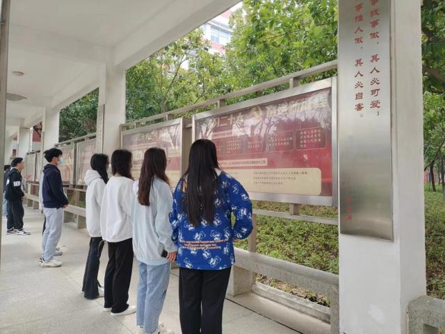 展板内容清晰、生动新颖,以图文并茂的形式,展示了党的二十大报告的“大会主题”、“三个务必”、“十年来三件大事”、“五个重大原则”、“中国共产党的中心任务”、“中国式现代化的本质要求”、“伟大创举”、“五个必由之路”等理论精髓。每到一处,师生们认真驻足观看、仔细聆听讲解、细心记录笔记,现场感受新时代十年的伟大成就。