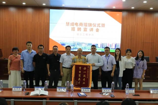 10月12日下午,慧成电商集团总经理及创始人洪志荣等一行8人莅临我校,向信息工程学院赠送锦旗,并召开专场招聘宣讲会。信息工程学院党总支书记王火灵、院长林晓鹏和部分专业老师参加赠旗仪式,2018级电商和数媒专业学生到场聆听。副院长张志杰主持会议。