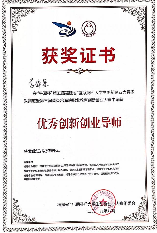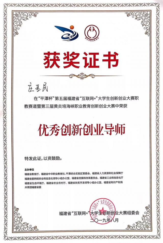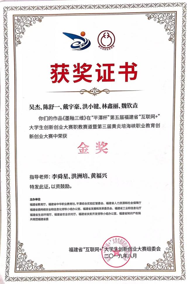 8月27日,“平潭杯”第五届福建省“互联网+”大学生创新创业大赛职教赛道暨第三届黄炎培海峡职业教育创新创业大赛在平潭举行。经过激烈角逐,我系辅导员李舜星、黄福兴和学生处洪洲培老师指导的“墨釉三维”项目以总分第二名的成绩荣获创意组金奖,同时荣获“最佳创意奖”;系团总支书记庄亚民与生物系团总支书记吴姗等老师共同指导,电子3131徐伟杰校友发起的 “MF航测全流程解决方案”项目同时荣获创意组金奖,李舜星和庄亚民老师均荣获“优秀创新创业导师”称号。