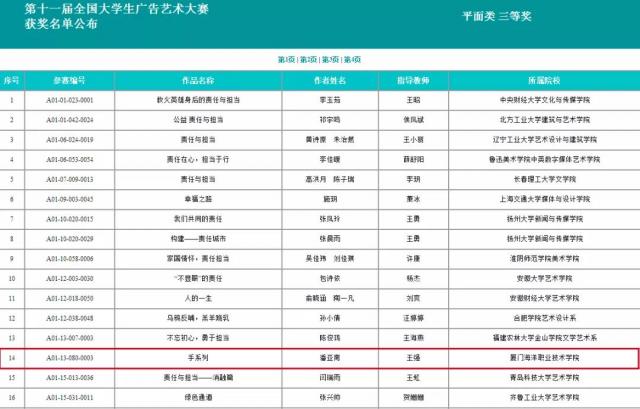 近日,第十一届全国大学生广告艺术大赛全国总决赛成绩揭晓,由信息技术系王强老师指导,数媒3182班潘亚南同学创作的《手系列》作品荣获平面类三等奖。