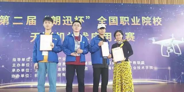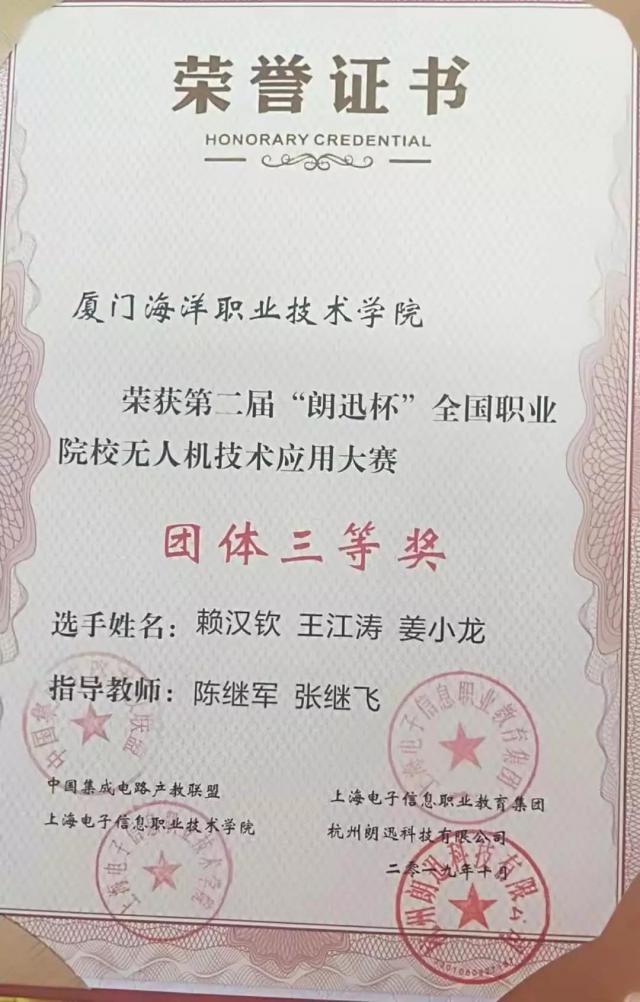 10月19日,第二届“朗讯杯”全国职业院校无人机技术应用大赛在上海举行。由我系陈继军和张继飞老师指导,物联网3171班赖汉钦、王江涛,电子3182班姜小龙三位同学组成的代表队荣获团体三等奖。
