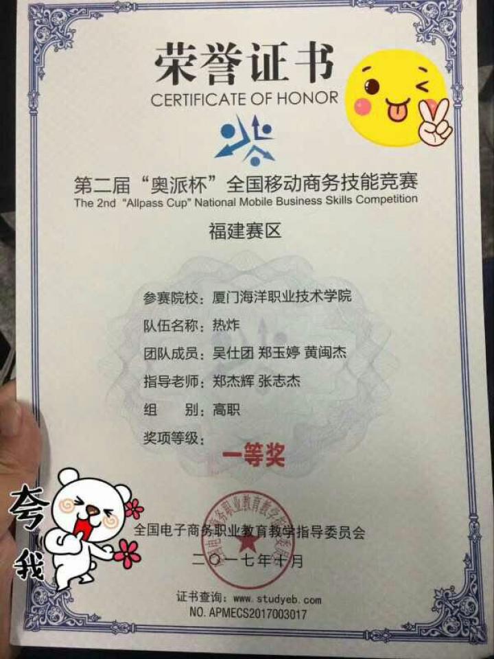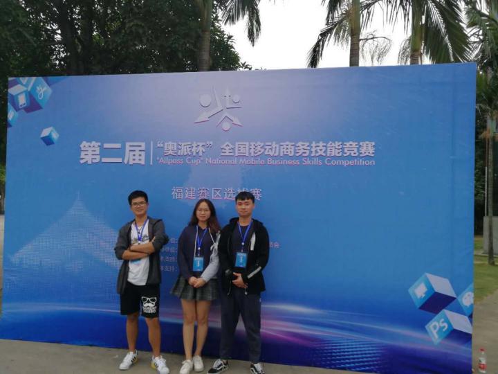 11月12日,2017年“奥派杯”全国移动电子商务技能竞赛福建赛区选拔赛在福建船政交通职业技术学院落下帷幕。由我院信息技术系电子商务专业15级和16级共同组建的三支队伍共9名学生选手在郑杰辉老师的带领下参加了该项赛事。经过激烈的比拼,我院学子共取得了一个一等奖,两个三等奖的优异成绩,其中一等奖团队顺利获得进军国赛的机会。