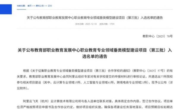 近日,教育部职业教育发展中心公布了“职业教育专业领域垂类模型建设项目(第三批)入选名单”,全国共遴选出77所院校参与建设。我院数媒教研室牵头申报的《人工智能赋能海洋产业数智化转型》项目经过层层评审,成功入选。