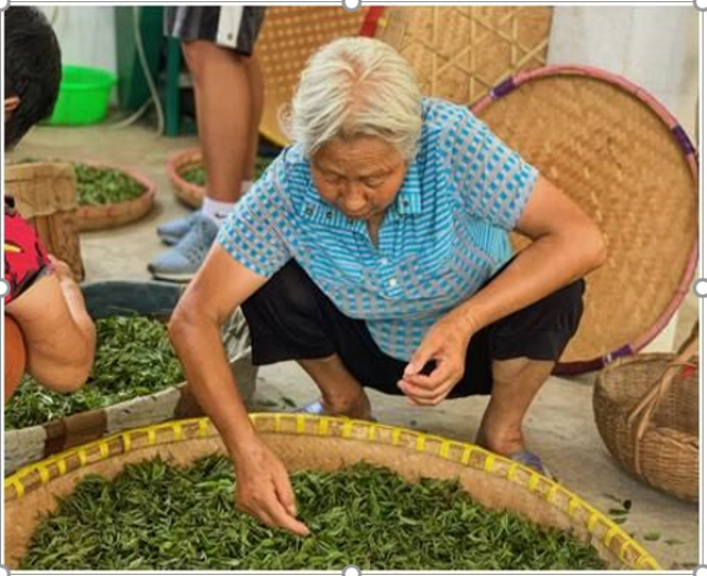 假期里,我和当地茶农来到了高山茶园采茶。早上6点钟起床,吃过早餐后就开始上山采茶。靠种茶脱贫的管师傅介绍说:“村里目前约有茶叶种植户100余户,主要种植‘高山茶’。高山茶是乌龙茶,其外形紧结、重、实,色泽乌绿、油润,香气清高悠长,味浓甘爽,叶底肥厚软亮,具有显著的高山茶韵和持久耐泡的品质特征。”在采茶的过程中,茶农们还不忘跟我介绍:“采摘对炒制好茶非常重要,它既是优良茶树栽培的结果,又是茶叶加工的开端。茶叶鲜嫩匀度要求高,只能采摘嫩叶,老叶无法用,这些细嫩的部分,采下来后称为茶青。”采摘好的茶叶按照每家每户的竹筛整齐排放在作坊中。村民们介绍到:“茶叶采完就在竹筛里摊开来放一放,这样品质会好很多。”在茶叶作坊中,村民们耐心地向我传授鲜叶的剔别技巧:“这些叶子要大小均匀,不能单片叶、对夹叶、鱼叶、虫伤叶、紫叶、红叶……”