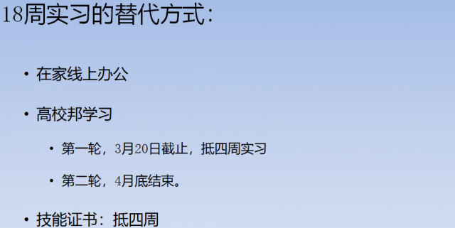 及时传达毕业相关工作部署。解释暂停实习的原因及必要性,上学期顶岗实习及成绩录入的工作安排,本学期因疫情对实习环节调整、习讯云平台上的要求、高校邦平台的学习替代等方式;强调毕业论文或实习报告、学习心得撰写要求,并对毕业前考试、毕业审核要求等进行解释说明。