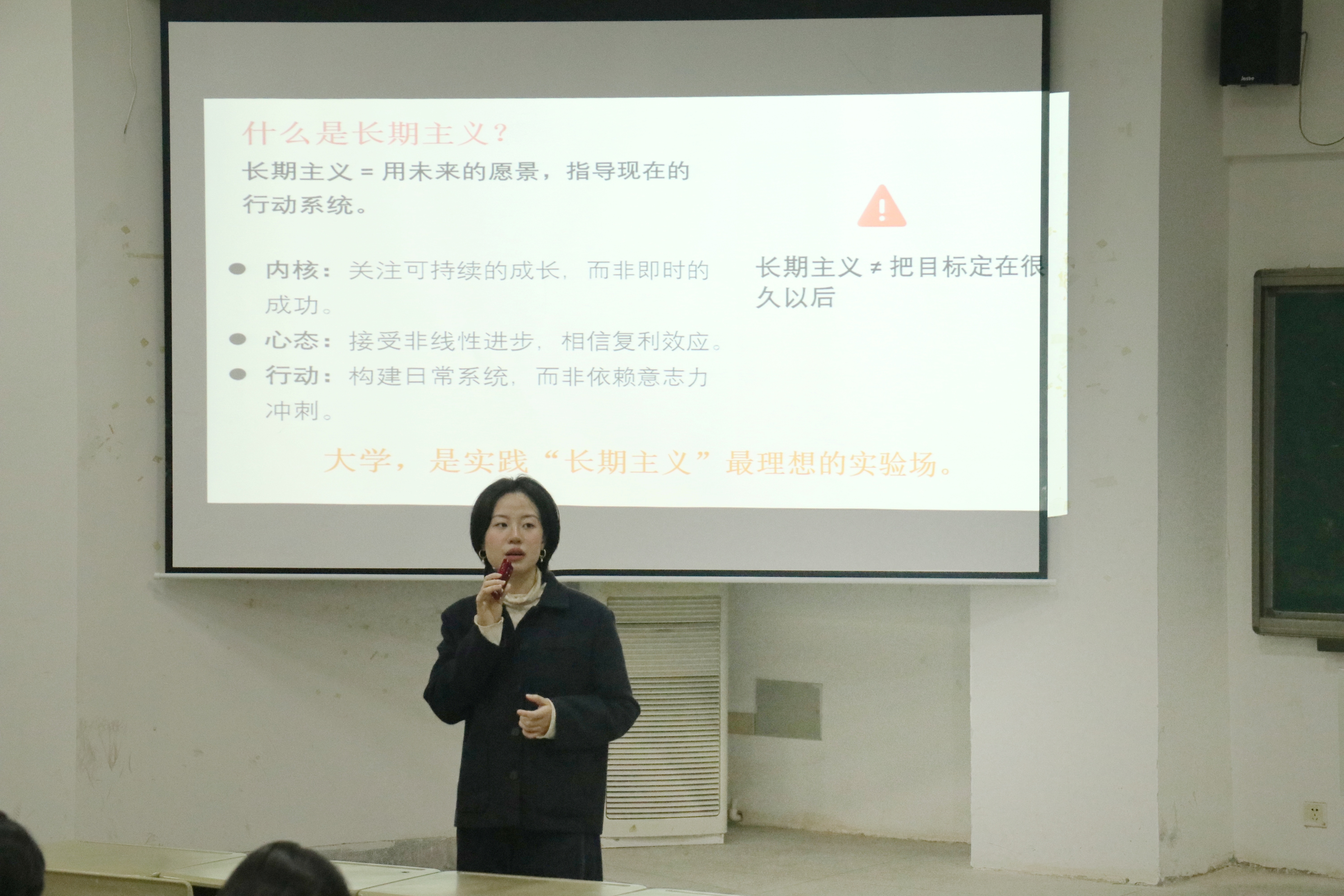 讲座从学业压力、目标规划等常见问题切入,吴羽荻老师指出,在快节奏生活中,短期情绪与结果容易带来焦虑与内耗,而“长期主义”能帮助我们在不确定中保持方向、稳步前行。她结合理论与案例,阐明情绪管理、自我认知与目标坚持的关联,强调真正的成长是建立在理解自我、尊重内心节奏之上的可持续努力,并鼓励同学们着眼长远、学会与情绪共处,在行动中积累成长。