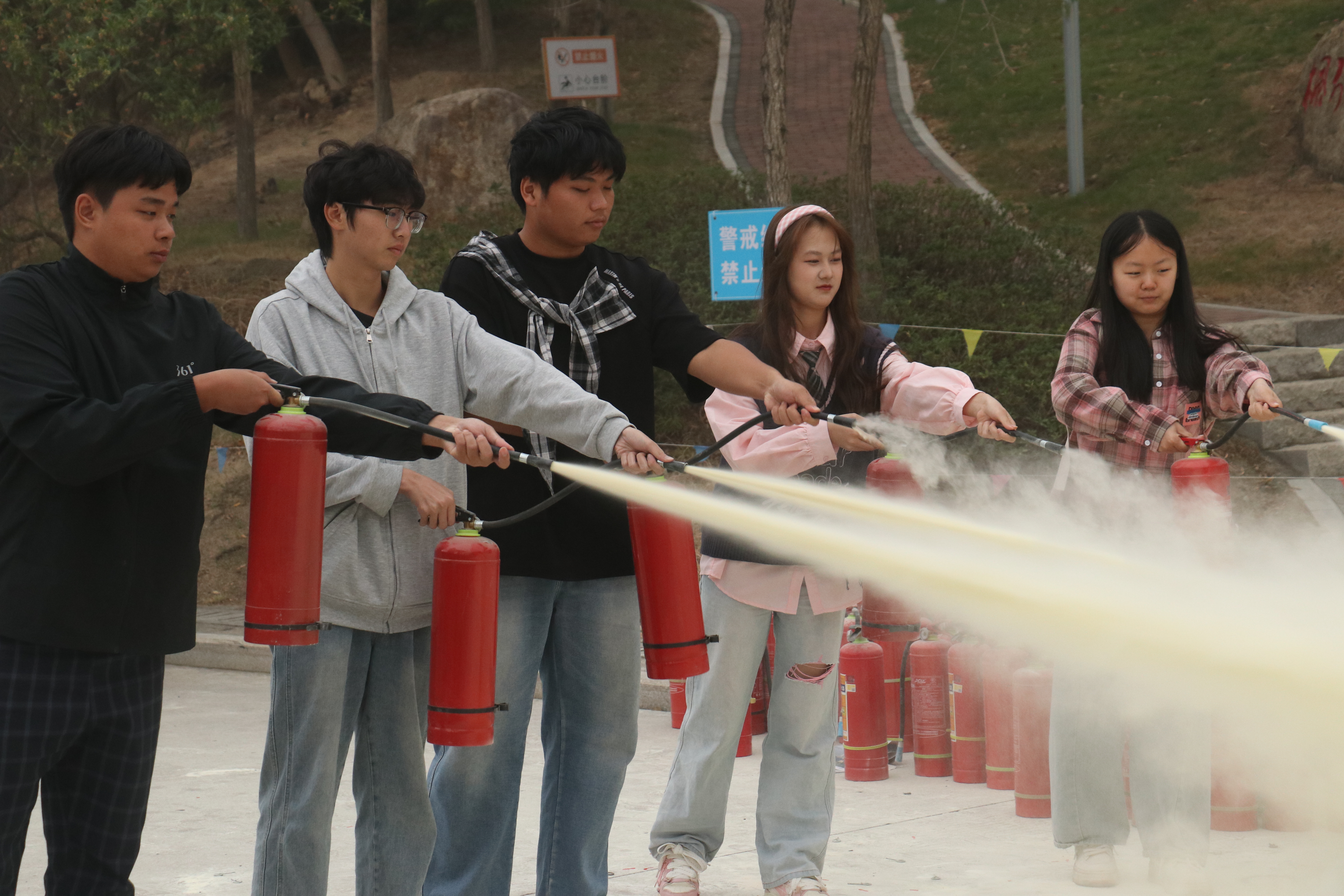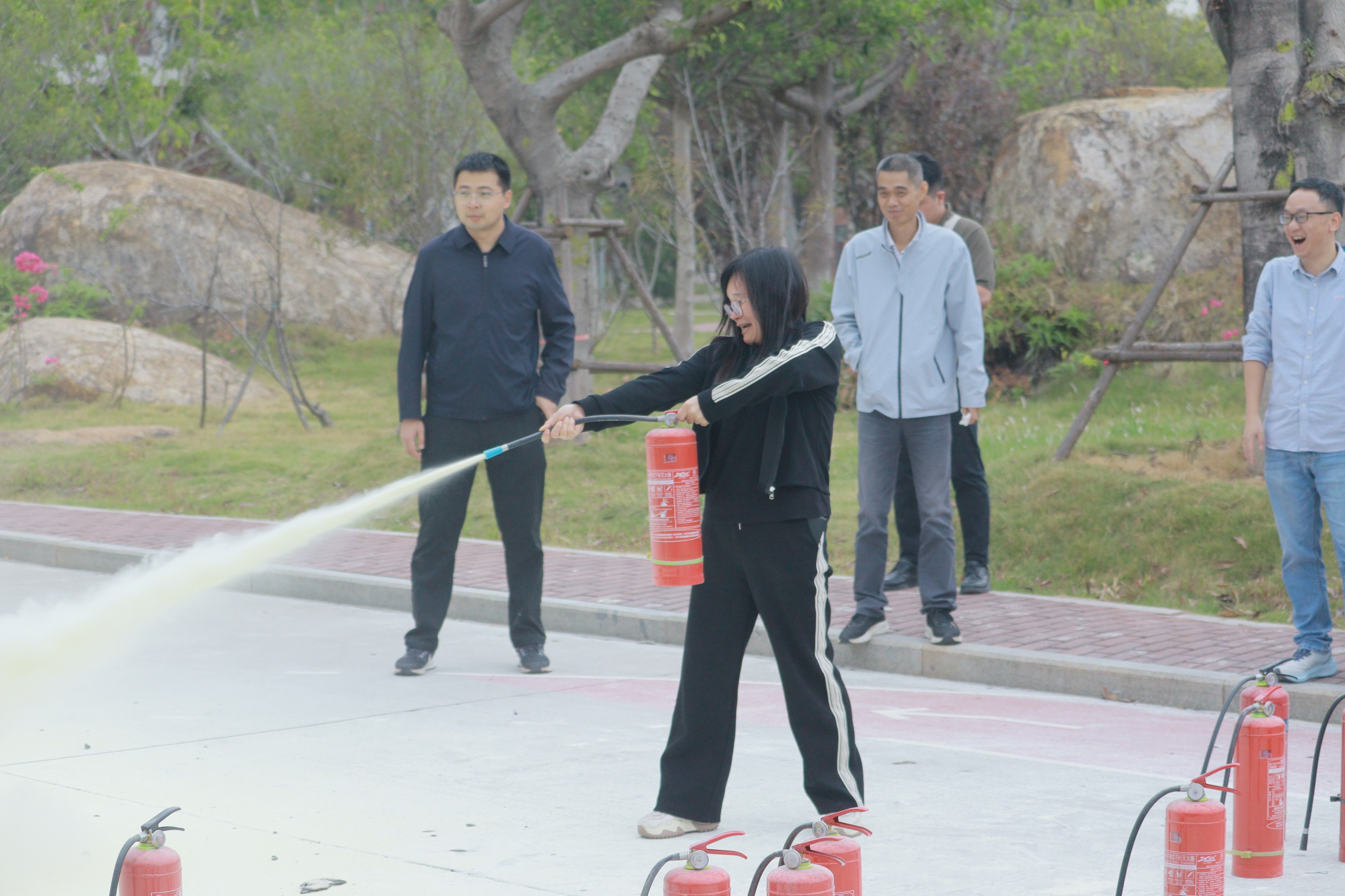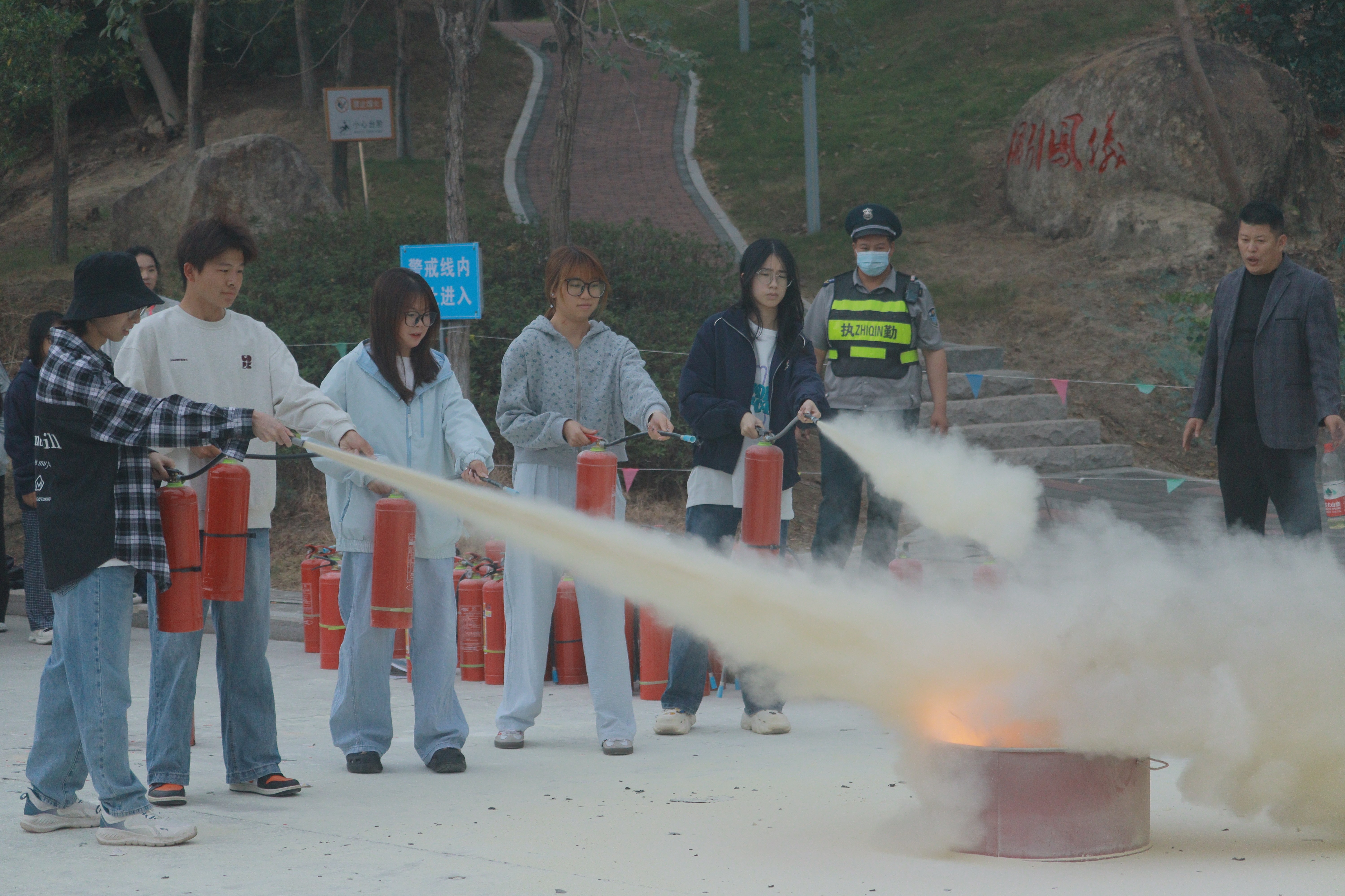 在实操环节,师生们按照规范流程完成拔销、瞄准、喷射等一系列动作,迅速将模拟火盆中的火焰扑灭。整个过程紧张有序,参与者从生疏到熟练,切实掌握了灭火器使用技能,提升了应对火灾的信心与能力。