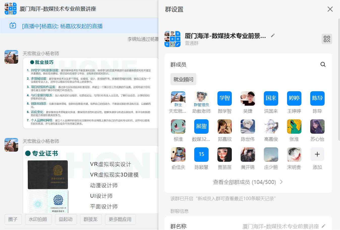 2024年1月22日福建天宏创世科技有限公司通过钉钉APP在线上举办数媒专业就业前景讲座暨专场招聘宣讲会。公司HR杨嘉欣、动效组总监方丽炎和信息工程学院数字媒体技术专业老师参加本次活动。