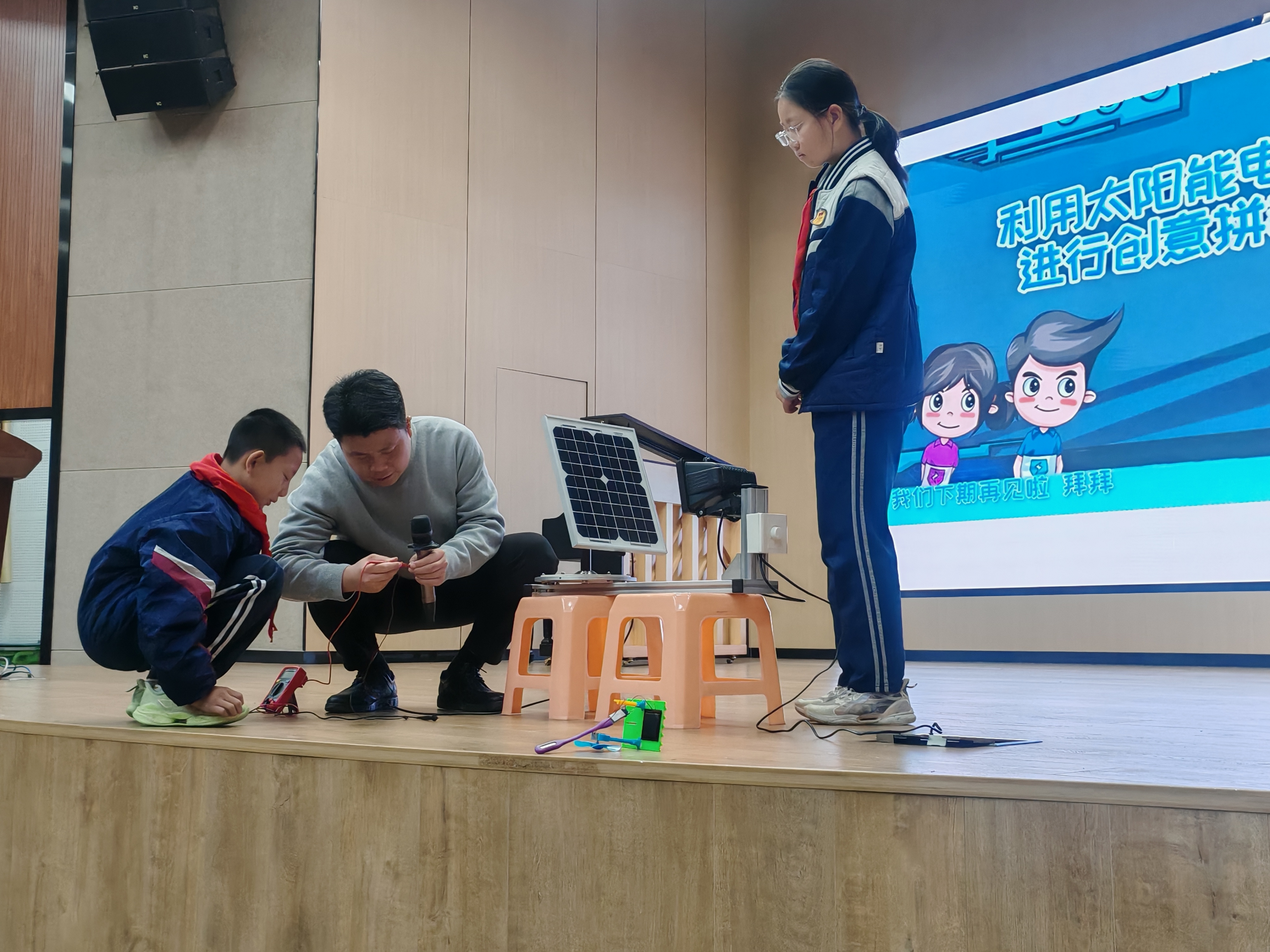 讲座从“晒晒太阳就能发电”的神奇现象切入。孙博士手持太阳能板,在教室灯光下成功驱动小风扇转动,用“光子像小拳头敲击电子”的形象比喻,将抽象的“光伏效应”拆解成孩子能听懂的语言,并展示太阳能小车、LED灯模型,直观呈现清洁能源的应用潜力。