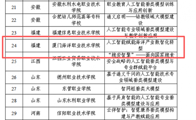 近日,教育部职业教育发展中心公布了“职业教育专业领域垂类模型建设项目(第三批)入选名单”,全国共遴选出77所院校参与建设。我院数媒教研室牵头申报的《人工智能赋能海洋产业数智化转型》项目经过层层评审,成功入选。